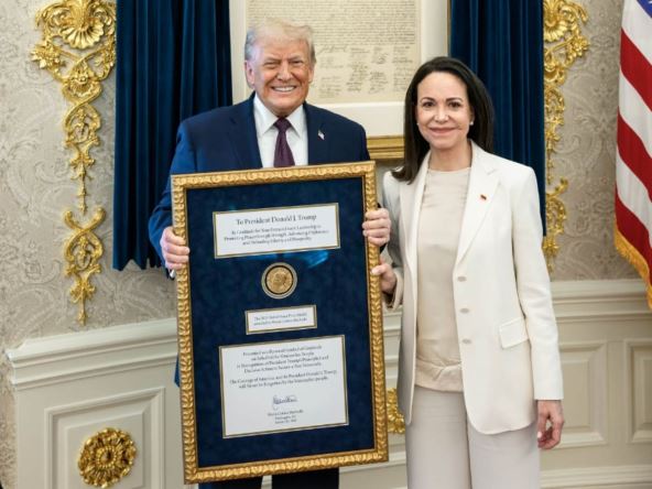 Venecuelanska opoziciona liderka Marija Korina Mačado juče je tokom sastanka u Beloj kući američkom predsedniku Donaldu Trampu uručila medalju Nobelove nagrade za mir.