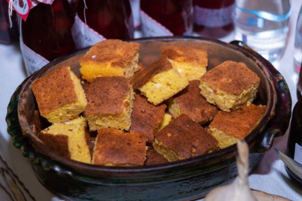 Može se služiti topla, odmah nakon što se izvuče iz pećnice, a kukuruzno brašno pruža kontrast slanim dodacima, od slanog kajmaka do posutih čvaraka.
