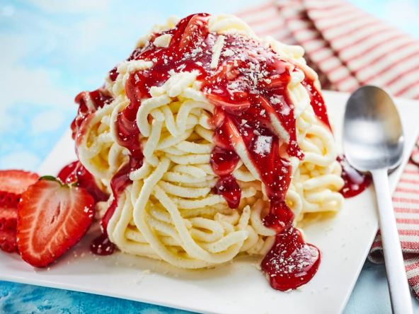 Pravi se od vanila sladoleda koji se provlači kroz presu kako bi podsećao na testeninu, zatim se preliva sosom od jagoda koji glumi "sos" i posipa belom čokoladom kao "parmezanom".