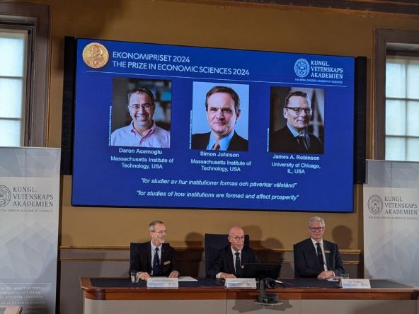 Švedska kraljevska akademija nauka saopštila je da su ovogodišnji dobitnici Nobelove nagrade za ekonomiju Daron Ačemoglu, Sajmon Džonson i Džejms Robinson.