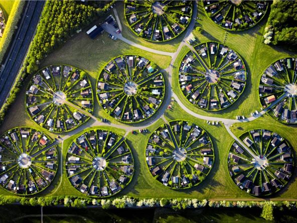Na periferiji Kopenhagena nalazi se neobično naselje Brondbiu kome se kuće nalaze u savršenim krugovima okružene isto tako savršenim zelenilom.
