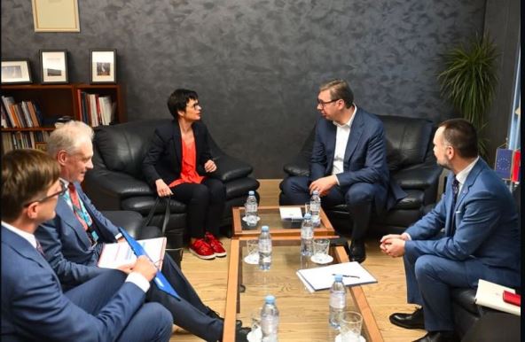 Predsednik je nakon razgovora sa komesarkom Kos rekao da su govorili o evropskom putu Srbije i da je sastanak protekao u pozitivnom tonu, saznaje EUpravo zato sa lica mesta.